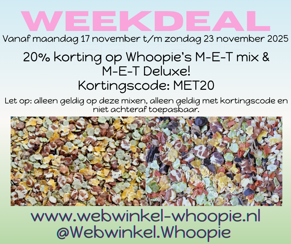 Whoopie’s M-E-T Deluxe is de luxe variant op de M-E-T Mix, aangevuld met havervlokken, johannesbrood en wortelvlokken. Deze mix biedt extra variatie in smaak en structuur en sluit mooi aan als gezonde knabbel- en foerageersnack naast de dagelijkse voeding.