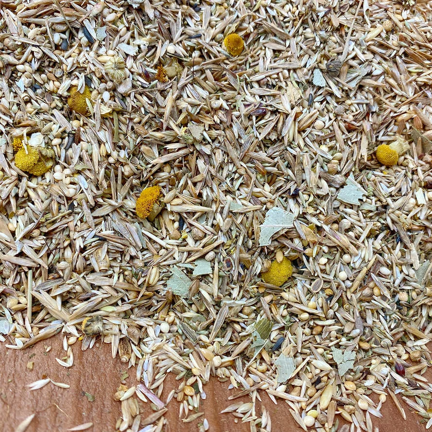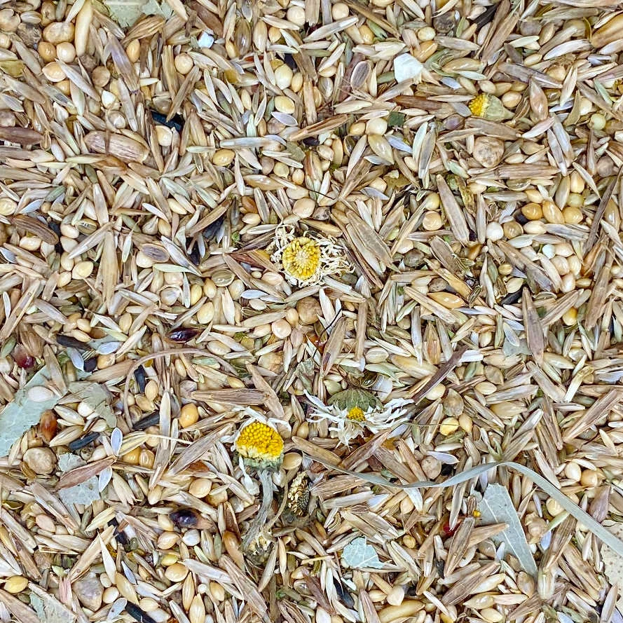 Samenstelling: graszaad, Senegal millet, zilvergierst, spinaziezaad, slazaad, sesamzaad, Plata millet, groene millet, Japanse millet, brandnetelzaad, wortelzaad, Delicha, Pagima Green, nigerzaad, kanariezaad, naakte haver, amarant, anijszaad , venkelzaad, mariadistelzaad, basilicumzaad, dillezaad, chiazaad, fonio paddy, tijm, oregano, madeliefjes en kamille.