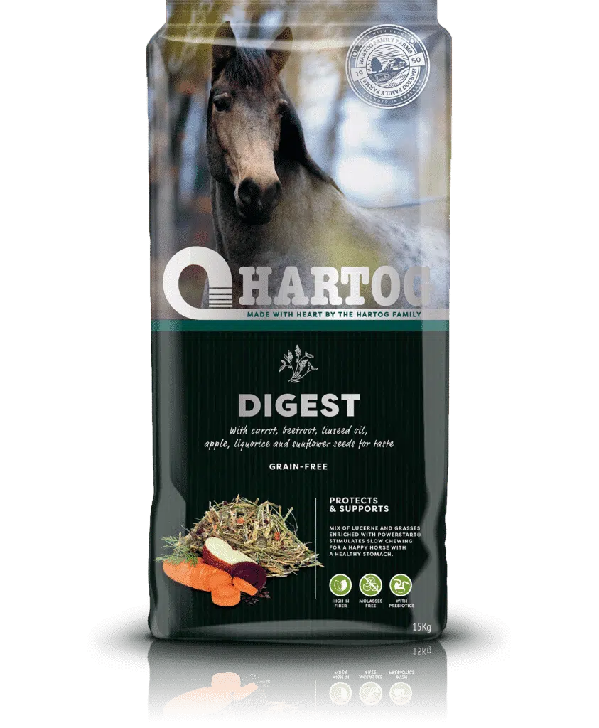 Ontdek de voordelen van de Hartog Digest. De Hartog Digest is speciaal samengesteld om de spijsvertering van het paard te ondersteunen. Ideaal voor paarden met een gevoelige maag, gevoelige darmen of spijsverteringsproblemen.De Hartog Digest is een hoogwaardige ruwvoermix, welke speciaal is samengesteld om het verteringsstelsel te ondersteunen. De Hartog Digest is een ruwvoermix met een brokje vol met gezonde toevoegingen, zoals postbiotica en magnesium.Postbiotica levert de juiste combinatie van metabolieten om de microbiota te voeden, in balans te houden en de darmgezondheid te ondersteunen. De Hartog Digest is ideaal voor paarden met gevoelige darmen of spijsverteringsproblemen, en kan bijdragen aan een gezonde en evenwichtige spijsvertering.Het voeren van de Hartog Digest stimuleert het aantal kauwbewegingen. Door de toename van het aantal kauwbewegingen wordt de speekselaanmaak gestimuleerd. De toegenomen hoeveelheid speeksel, de toegevoegde magnesium en het van nature hoge calcium gehalte van luzerne helpen het maagzuur te neutraliseren. Dit kan de maaggezondheid ondersteunen.De Hartog Digest is laag in suiker en zetmeel en vrij van zowel granen als melasse. Door de toegevoegde stukjes appel, wortel, biet en lijnzaadolie is de Hartog Digest toch erg smakelijk en geschikt voor moeilijke eters.