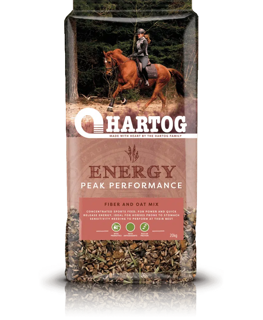 De Hartog Energy is een hoogwaardige muesli die je paard voorziet met extra energie. Deze muesli is rijk aan benodigde voedingsstoffen voor topprestaties en is ideaal voor paarden die veel energie verbruiken.De Hartog Energy voorziet een sportpaard met alle benodigde vitamine, mineralen en spoorelementen als aanvulling op ruwvoer. Deze sport muesli met haver is vooral geschikt voor paarden met een verhoogde energiebehoefte, bijvoorbeeld bij intensieve trainingen of wedstrijden. De Hartog Energy is samengesteld met verschillende hoogwaardige granen zoals haver, gerst, mais en spelt die zorgen voor extra energie. Daarnaast zijn er extra oxidanten aan de Hartog Energy toegevoegd door middel van druivenpit extract en extra vitamine E.