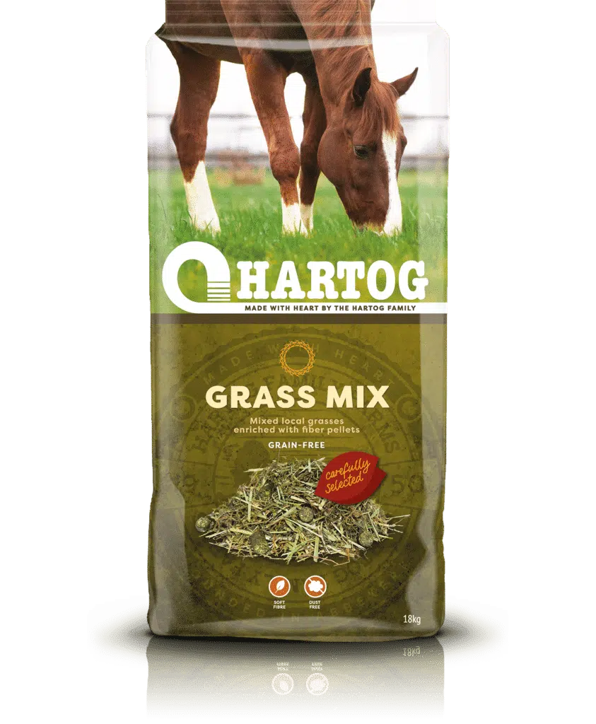 Ontdek de kracht van gras met de Hartog Grass Mix, een hoogwaardige ruwvoermix op basis van gras. Deze zorgvuldig samengestelde ruwvoermix is ideaal als aanvulling op, of vervanging van, het ruwvoer. Vooral voor paarden die behoefte hebben aan een hoge en constante kwaliteit ruwvoer.De Hartog Grass Mix is een zorgvuldig samengestelde ruwvoermix op basis van een hoogwaardige kwaliteit gras. Deze ruwvoermix is rijk aan zachte vezels wat het een ideaal product maakt als (gedeeltelijke) ruwvoer vervanging voor oude(re) paarden of paarden met een verminderd kauwvermogen. Daarnaast is het ook ideaal voor paarden met een behoefte aan een hoge en constante kwaliteit ruwvoer.De Hartog Grass Mix bevat zowel de stengels als het bladmateriaal van gras om alle voordelen van het gras te kunnen benutten. De stengels van gras leveren structuur en een hoog gehalte vezels. Het bladmateriaal van gras is rijk aan voedingsstoffen zoals van nature aanwezige vitamine, mineralen en spoorelementen.Het bladmateriaal van het gras is met plantaardige glycerine en een klein percentage melasse gebonden. Door het binden van het bladstof en het kunstmatige droogproces is de Hartog Grass Mix ook geschikt product voor paarden die gevoelig zijn voor stof.De Hartog Grass Mix kan los gevoerd worden of gemengd worden met krachtvoer/balancers. De mix is verrijkt met een grasbrok voor extra diversiteit en vezels. Door de hoge smakelijkheid en zachte structuur is deze ruwvoer mix ook uitermate geschikt voor moeilijke eters.