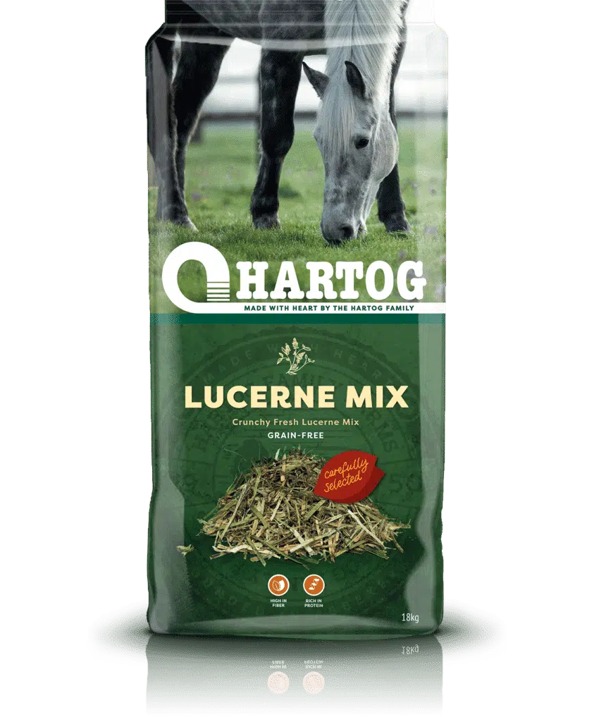 1 voerschep bevat ongeveer 250 gram Hartog Lucerne MixDe Hartog Lucerne Mix kan worden gemengd met krachtvoer/balancers om de eettijd te verlengen en speekselaanmaak te stimuleren. Dit is fijn voor paarden die gevoelig zijn voor bijvoorbeeld maagzweren. Daarnaast kunnen de vezels uit de Hartog Lucerne Mix helpen de darmgezondheid te ondersteunen.