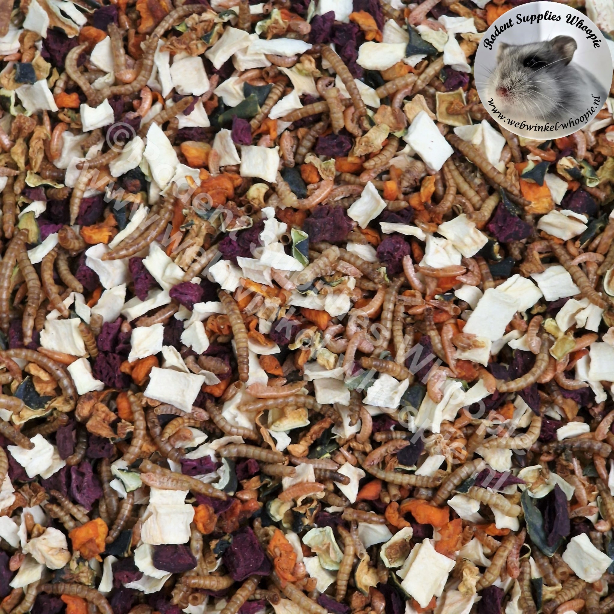 Whoopie's Kriebelige en Friemelige Groentemix bestaat uit verschillende soorten gedroogde groente gemixt met gedroogde insecten.