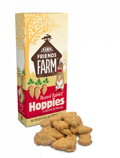 Russel Rabbit Hoppies met wortel en mint zijn smakelijke gebakken lekkernijen, vers uit onze bakkerij, gemaakt met de gezonde goedheid van natuurlijke granen en smakelijke groenten. Russel Rabbit Hoppies zijn perfect als u uw huisdier een smakelijke traktatie wilt geven. Ze kunnen zorgvuldig met de hand aan uw huisdieren worden gevoerd, zodat u samen bijzondere momenten kunt beleven. Een of twee kunnen ook rond de ruimte van uw huisdier worden verborgen om natuurlijk foerageren te stimuleren. En vergeet niet om uw konijnen dagelijks veel vers hooi en onbeperkte toegang tot water te geven. Russel Rabbit Hoppies zijn ook geschikt voor cavia’s, chinchilla’s, hamsters, gerbils, muizen en ratten.
