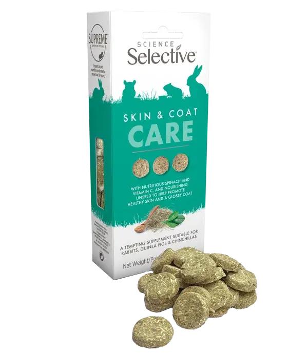 Science Selective Skin & Coat Care supplements zijn geformuleerd om een gezonde huid en een glanzende vacht te ondersteunen, met voedzame spinazie, vitamine C, timotheehooi en voedend lijnzaad voor omega 3& 6.