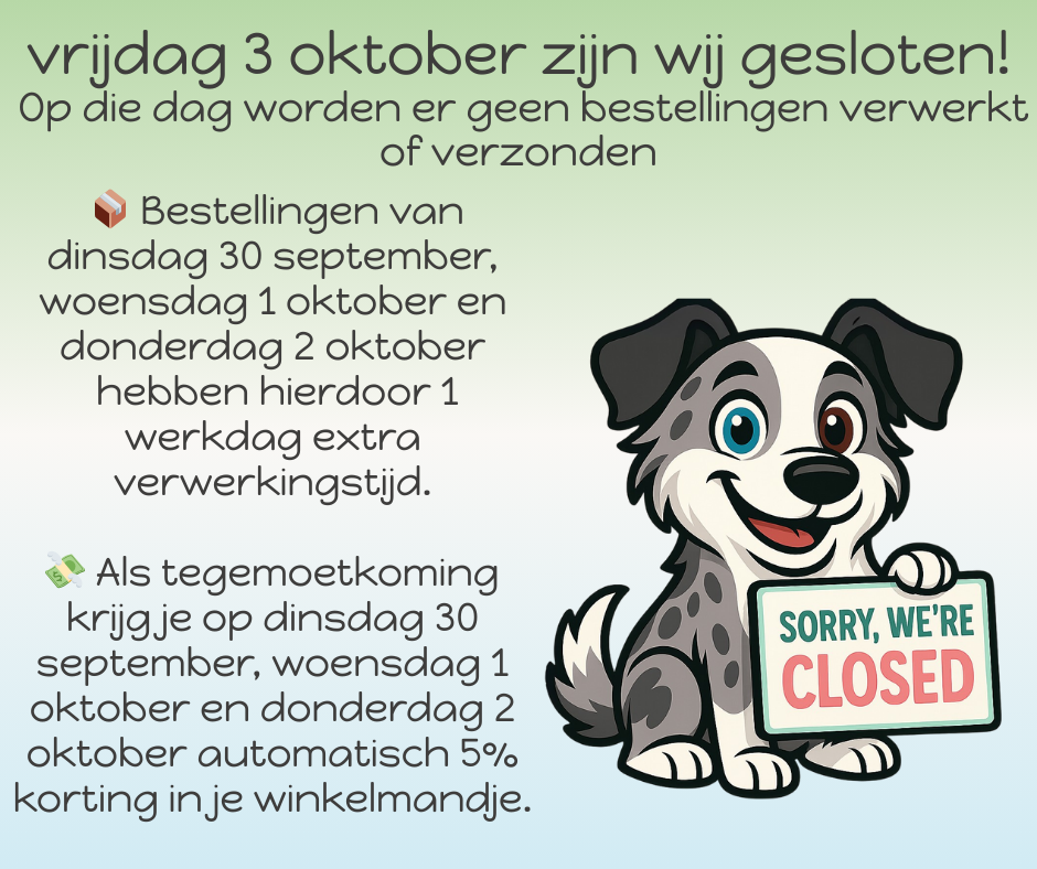 Houd er wel rekening mee: op feestdagen en dagen dat wij gesloten zijn, verwerken we geen bestellingen. Wanneer we gesloten zijn zie je hier: openingstijden bekijken
