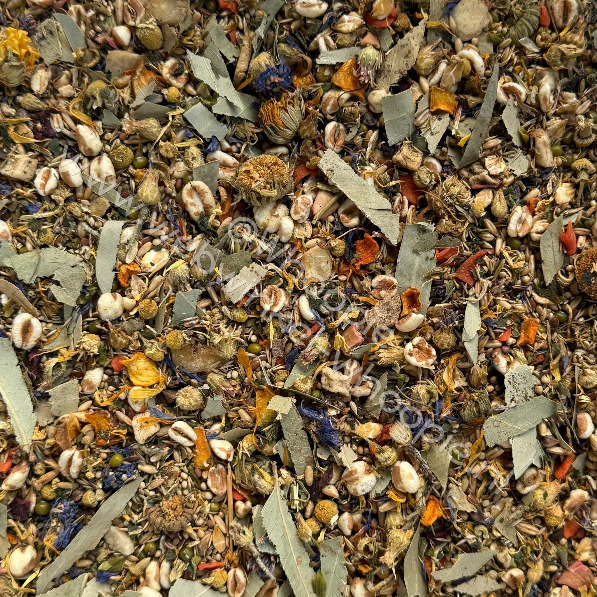 Gepelde haver, Japanse millet, witte millet, gepofte spelt, gerstvlokken, kanariegraszaad, lijnzaad, mungbonen, graszaad, bananenschijfjes gebroken, boekweit, brandnetelblad fijn, broccoli, eucalyptus bladeren gesneden, goudsbloem, kamille, korenbloemblaadjes blauw 1 ste klas, wortelvlokken, appelblokjes, pompoenvlokken, radijszaad, rode biet vlokken