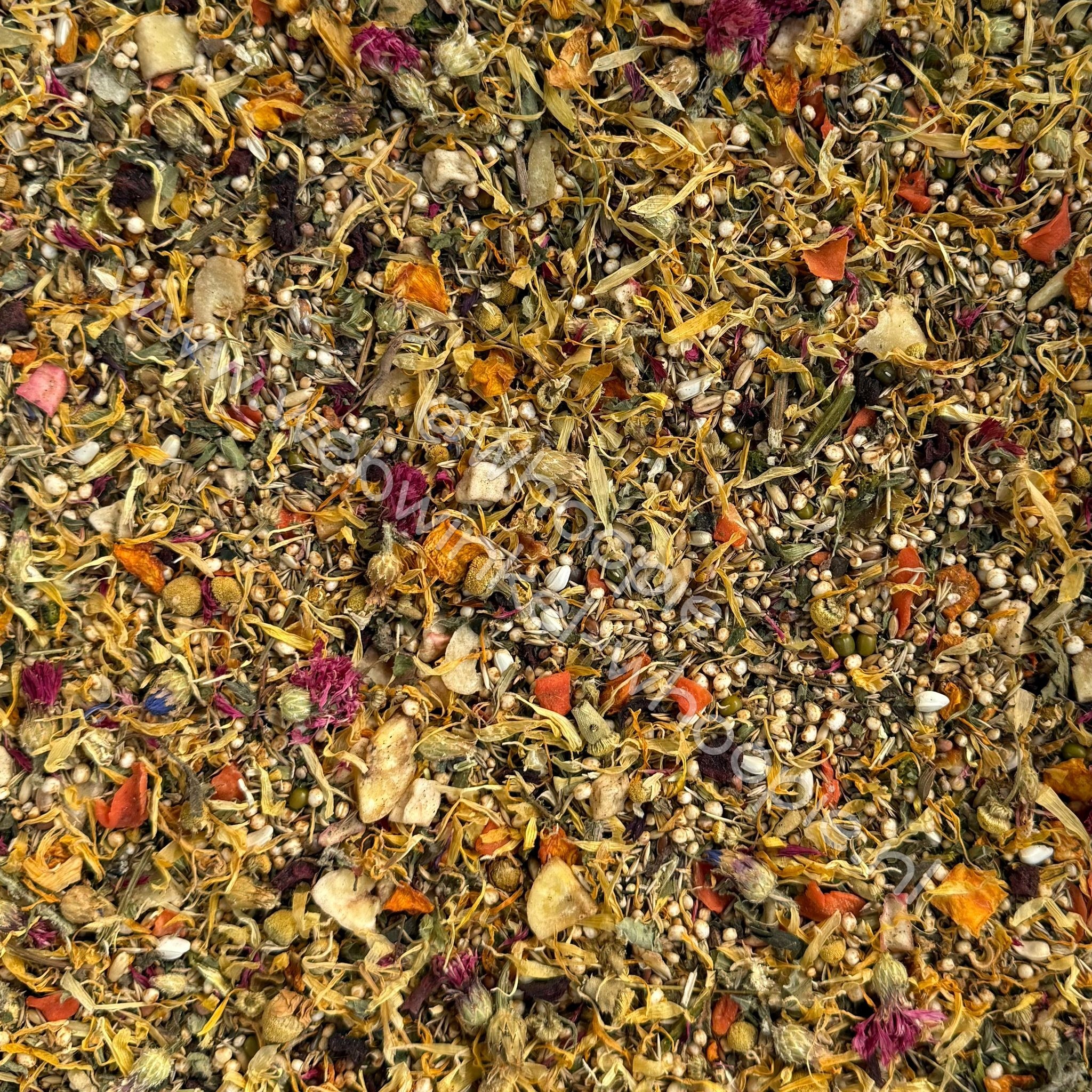 Tot slot is de mix verrijkt met citroenmelisse, brandnetelblad fijn, kamille, korenbloemblaadjes en goudsbloemblaadjes. Dat geeft extra geur, kleur en een fijne natuurlijke boost aan elke portie. Een heerlijke dagelijkse mix die niet alleen voedt, maar ook verrijkt.