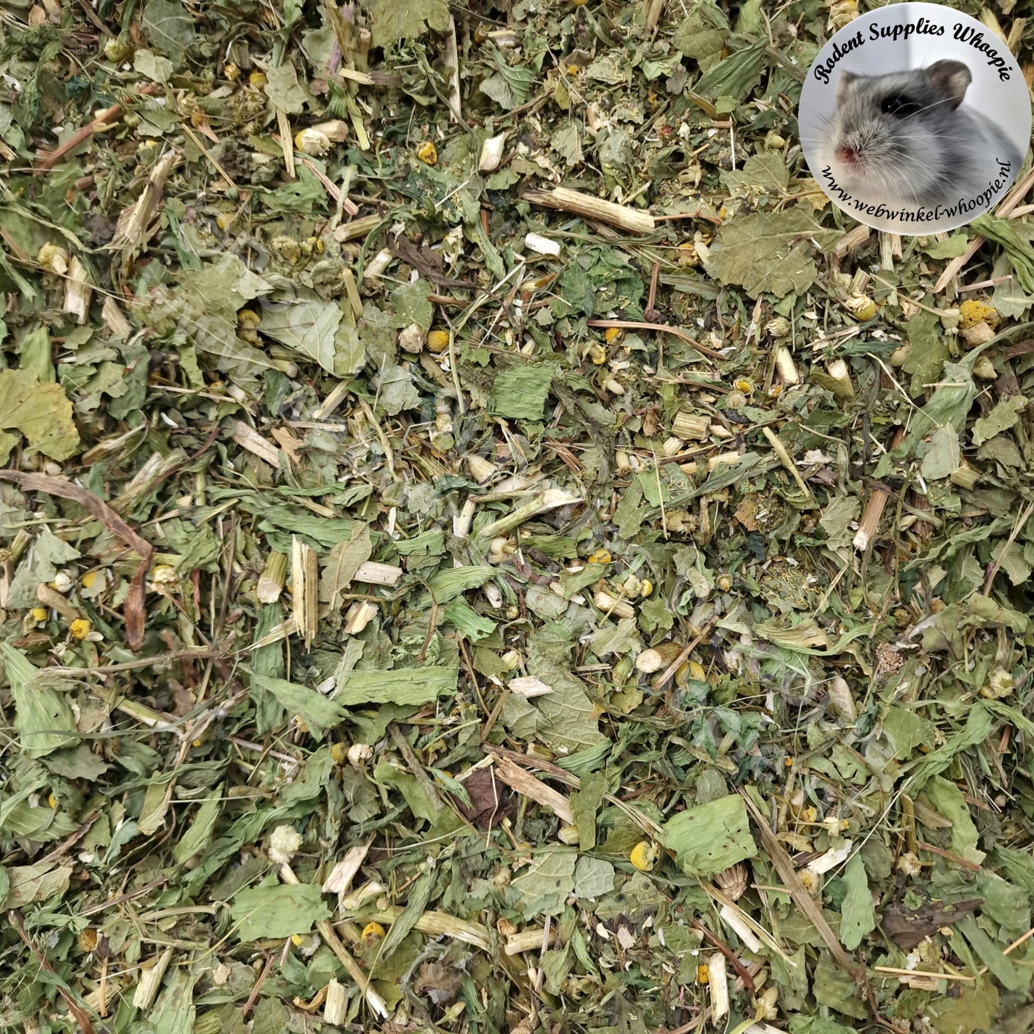 De basis van deze mix wordt gevormd door Echinacea-bladeren en -steeltjes (Echinacea purpurea). Deze plant staat al eeuwenlang bekend als een waardevol kruid. De bladeren en stelen zijn rijk aan ruwe vezels, die niet alleen bijdragen aan een evenwichtige voeding, maar ook zorgen voor extra knabbelplezier en variatie in het dagelijks menu.